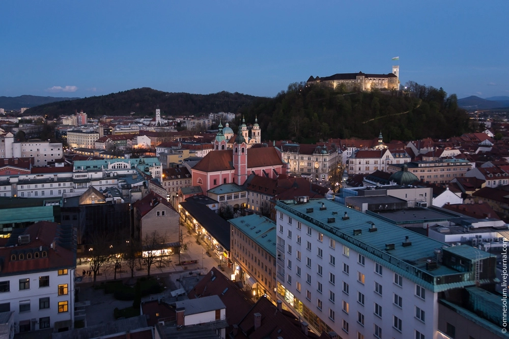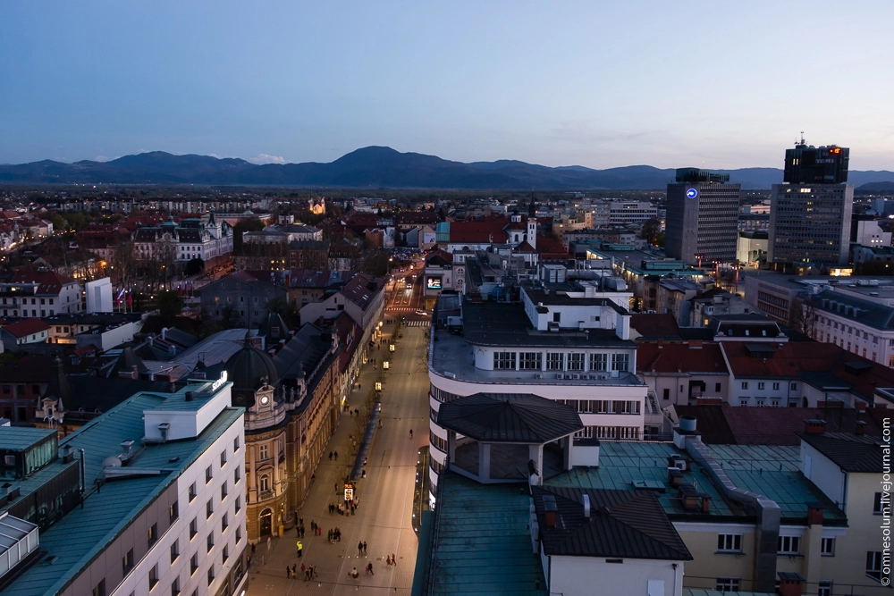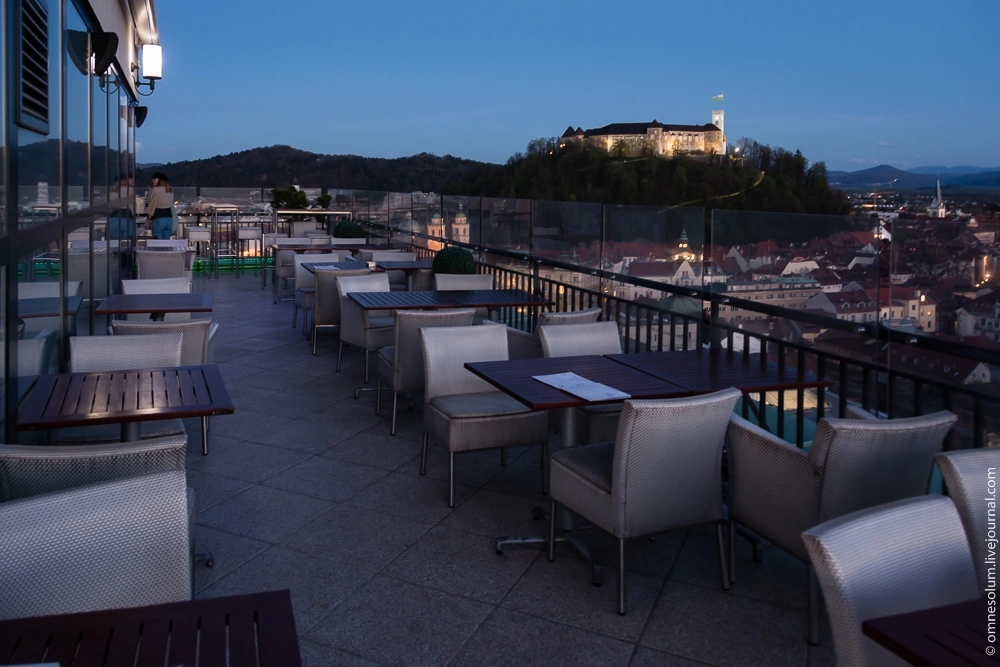 Тем временем уже начинало темнеть. Я надеялся успеть сфотографировать закат, но из-за поздней экскурсии на пивоварне пропустил этот момент. Тем не менее у меня оставался невыполненным ещё один пункт запланированной на первый день программы. Это была терраса кафе в Люблянском небоскрёбе, или по-словенски — Неботычнике.