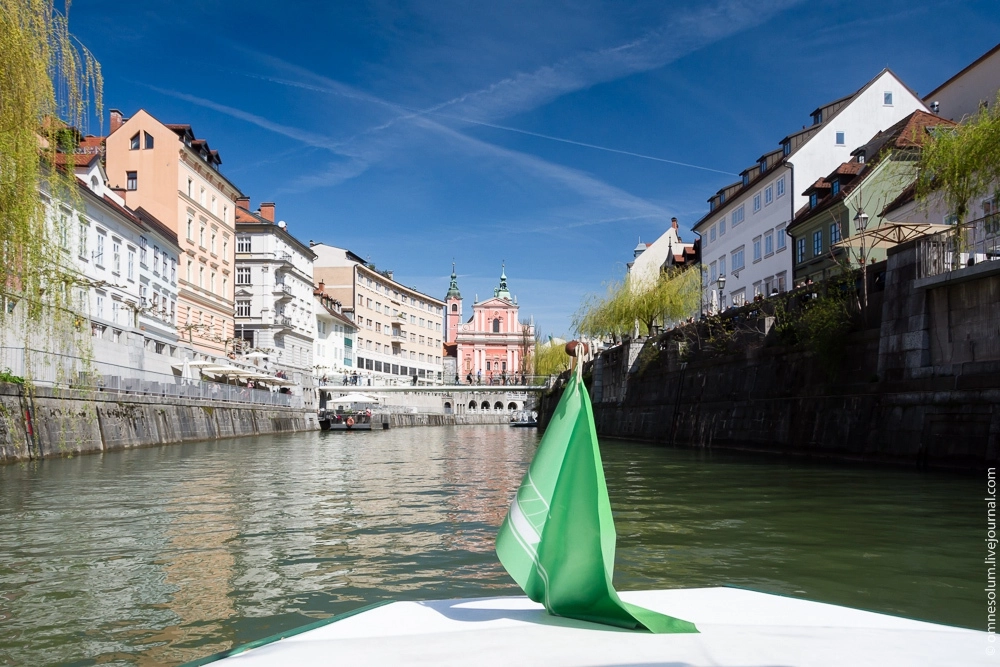 Прогулка заняла минут сорок. Сначала лодка плывёт на юг: народ пикникует на травке, мимо скользят другие лодки, из воды кое-где выступают мохнатые головы нутрий, завезённых в Любляну откуда-то из Нового Света, по словам кондуктора.