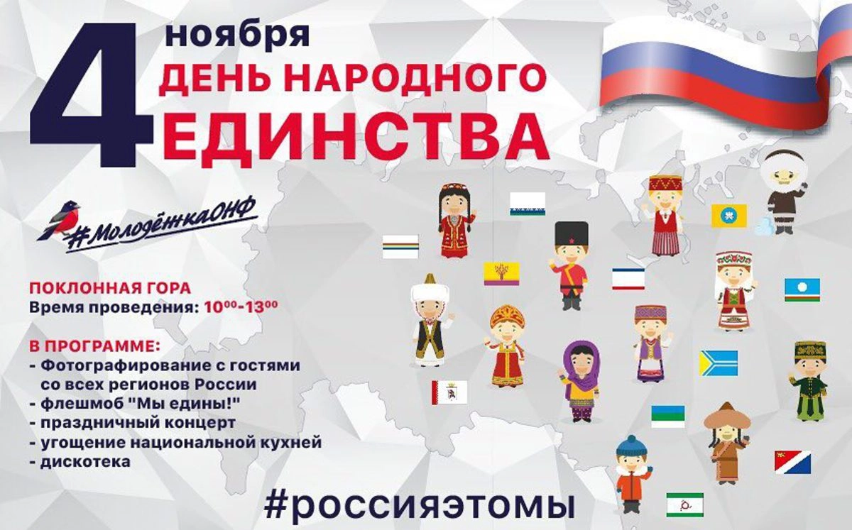 В честь Дня народного единства общественное движение «Молодежка ОНФ» проведет праздничные мероприятия во всех регионах России: общественники представили программу уличных викторин, мастер-классов, кулинарных поединков и других развлечений, которые пройдут в городских парках, скверах и площадях.