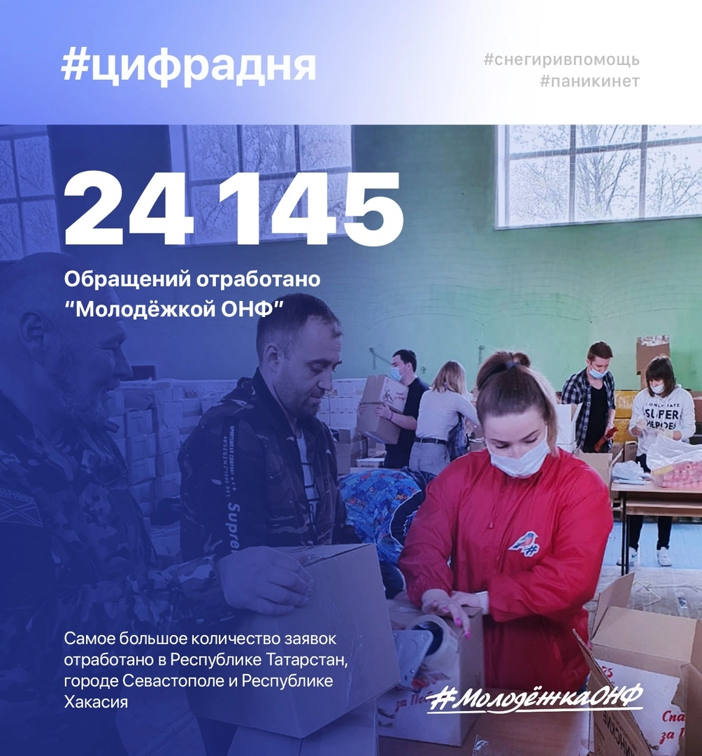 На сегодняшний день волонтерские штабы «Молодежки ОНФ» продолжают работу в 85 регионах России: в рамках акции «Мы вместе» добровольцы помогли выполнить 24 145 обращений.
