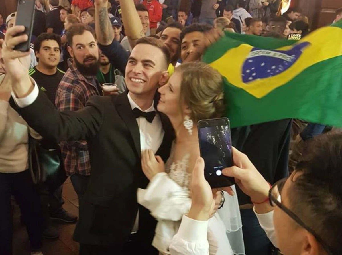 Молодожены отпраздновали свадьбу в толпе иностранных болельщиков