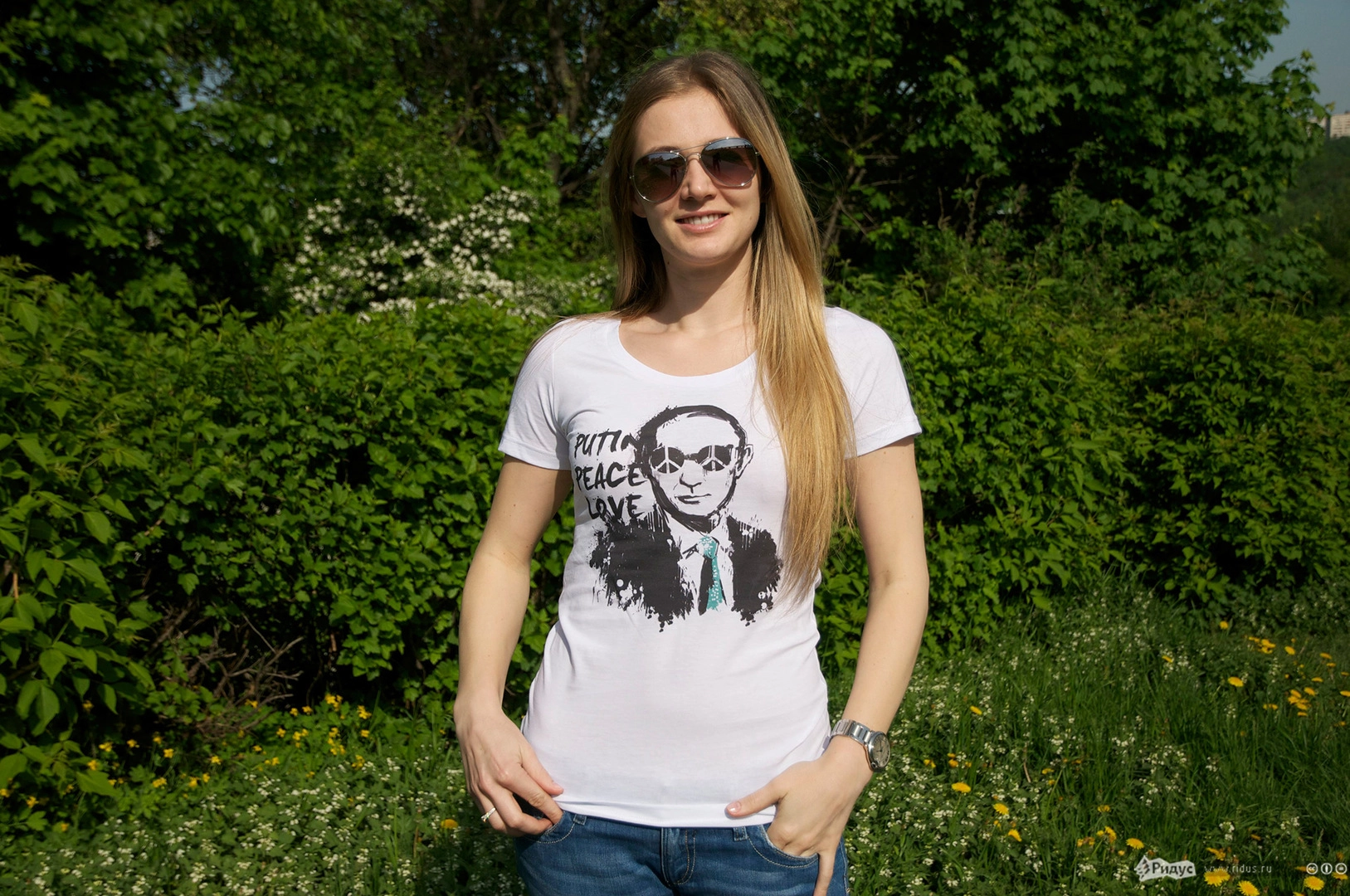 На майках глава государства изображен в самых разных образах - на фоне возвращенного Крыма, среди спасенных им животных, а также на коне с подписью "Нас не догонят" или "Самый вежливый из людей".