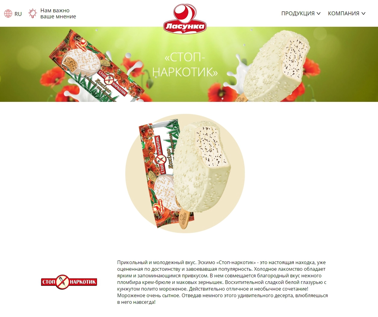 Однако «Ридусу» удалось выяснить, что «Стоп-наркотик» в той же упаковке, но с логотипом «Ласунка» вместо «Нежной прохлады» есть на сайте украинского производителя мороженого «Ласунка».