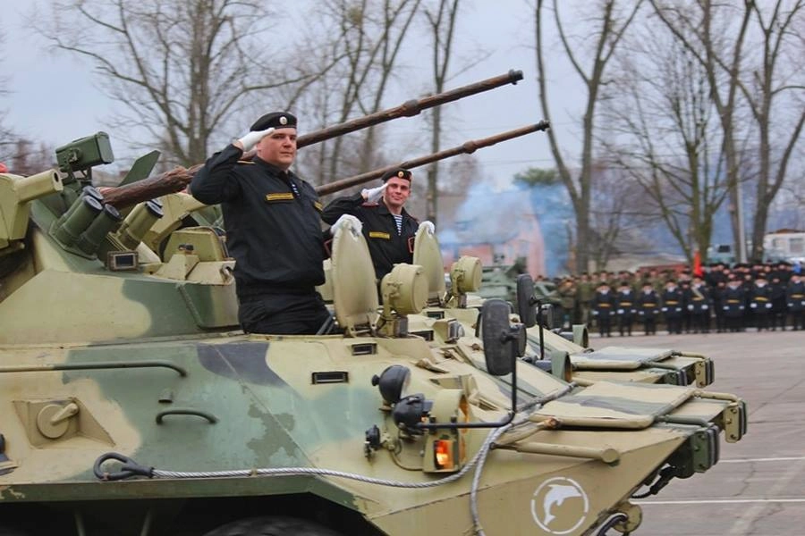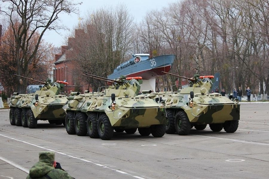В городе Балтийске Калининградской области в честь Дня морской пехоты экипажи нескольких бронетранспортеров БТР-82А из 336-й гвардейской бригады морской пехоты продемонстрировали отличные навыки управления боевой техникой, исполнив «вальс» под музыку духового оркестра.