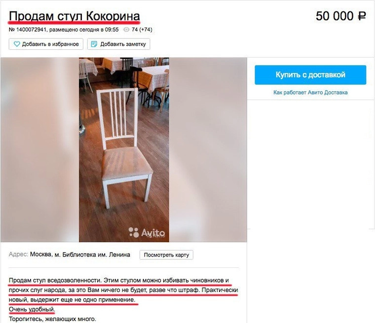 «Продам стул вседозволенности. Этим стулом можно избивать чиновников и прочих слуг народа, за это вам ничего не будет, разве что штраф», — гласит объявление.