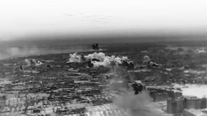 Стрельба по штабам и укрепрайонам боевиков велась из ракетных систем сирийского производства. Видео снято с разведывательного беспилотника в режиме «ночного видения».