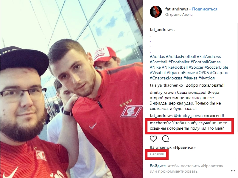 После потасовки у болельщика осталась ссадина на лбу, которую он продемонстрировал журналистам. Но пользователи соцсетей обратили внимание, что, судя по Instagram, месяц назад у него на лбу уже были красные пятна.