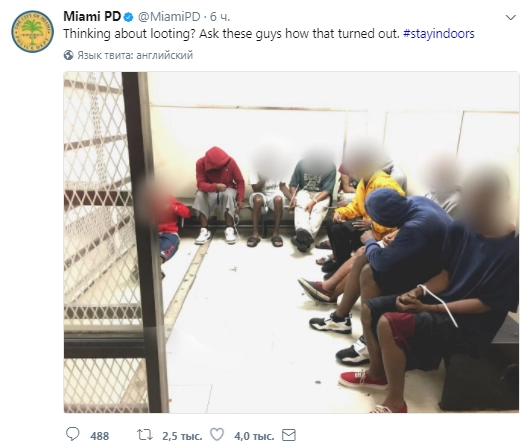 Полицейские штата пытаются бороться с кражами и грабежами. В Twitter полиции Майами появилась фотография нескольких молодых людей, задержанных за мародерство. «Задумываешься о мародерстве? Спроси этих парней, каково это», — гласит подпись к снимку.