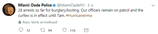 Полиция округа Майами-Дейд заявила о 28 арестах за мародерство. «К настоящему моменту 28 арестов за кражу со взломом / мародерство. Наши офицеры продолжают патрулировать округ, до семи утра действует комендантский час», — говорится в Twitter службы.