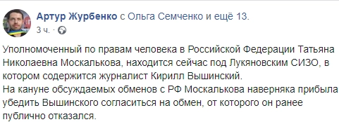 По его данным, «Москалькова прибыла убедить Вышинского согласиться на обмен, от которого он ранее публично отказался».