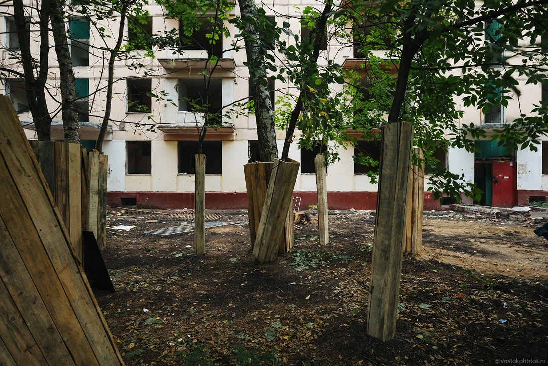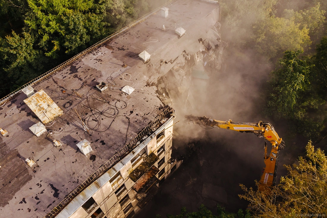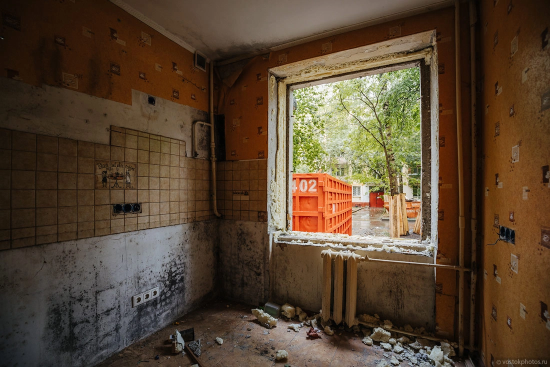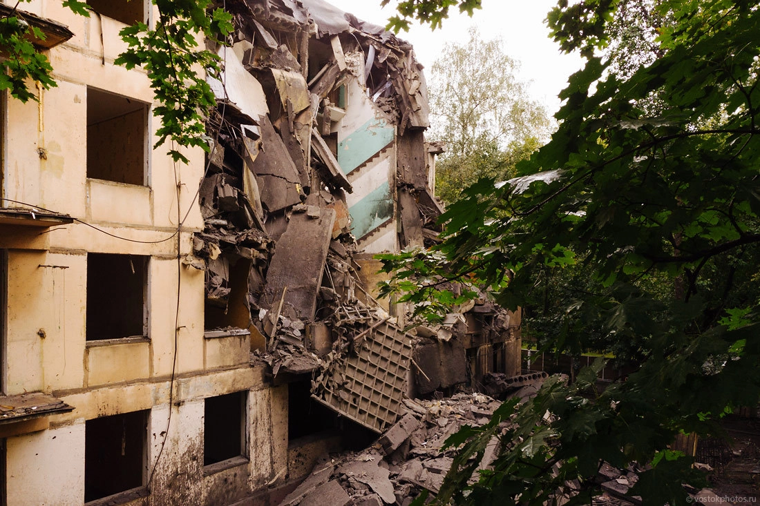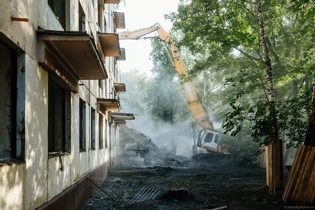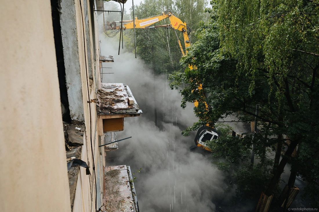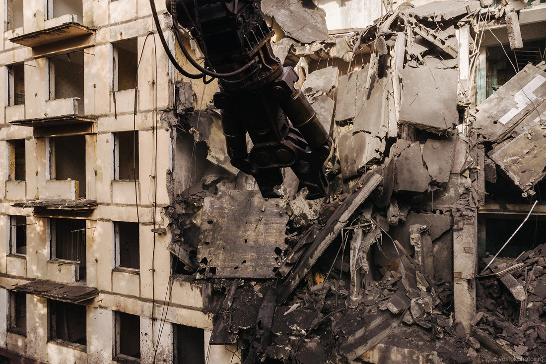 Все показательно красиво. Перед тем как снести жилой дом, его разбирают на комплектующие, оставляя лишь голые стены. Выносят стеклопакеты, весь возможный металл (решетки, двери, ванные