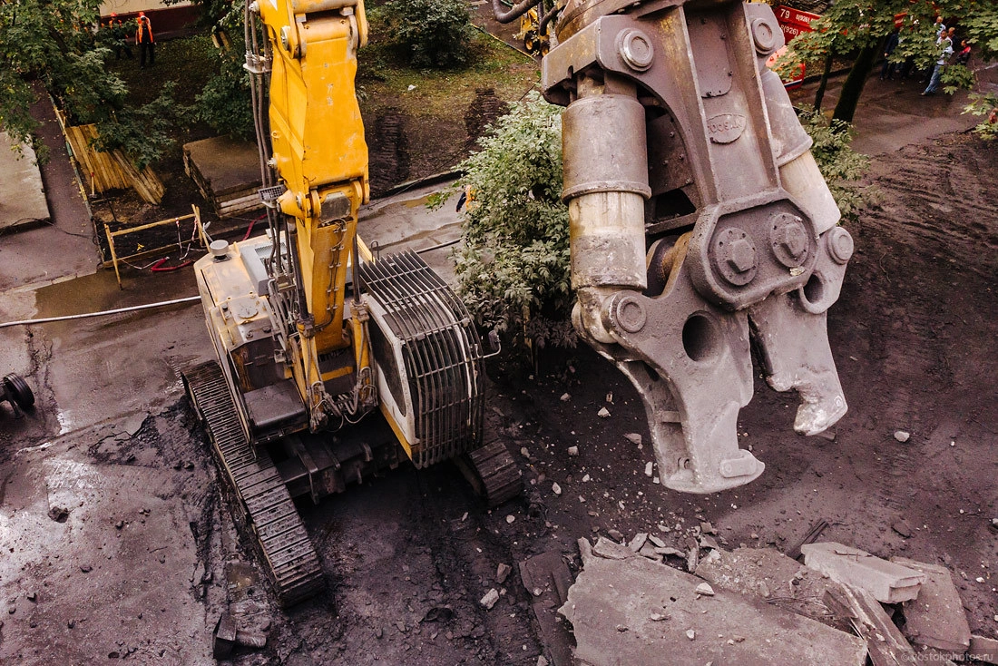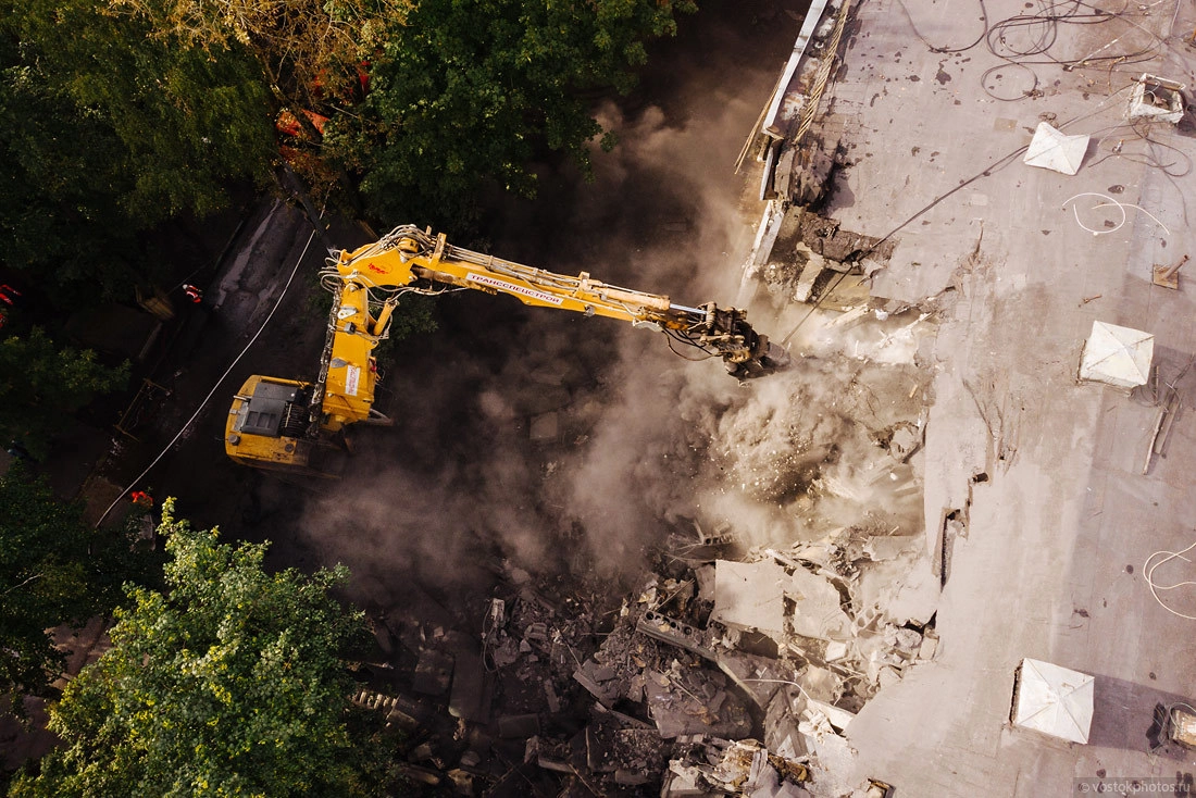 Одна из главных проблем, которая неизбежно возникает при сносе старых блочных домов, — это прочные наружные стены, которые представляют собой шлакокерамзитобетонные блоки. Во-первых, они довольно крепкие и для их сноса приходится использовать специализированную технику (сегодня простой экскаватор с шаром-бабой уже сложно встретить). Во-вторых — это шлак, который за полвека превратился в пыль.