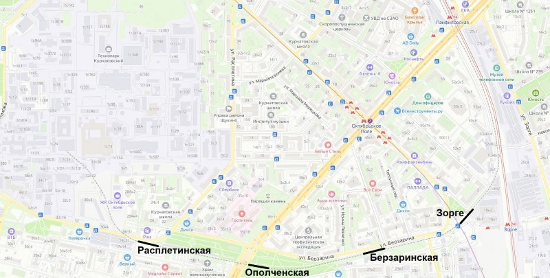 Западную конечную Расплетинская резонно разместить на пересечении улиц Берзарина и Расплетина. Здесь есть как сложившаяся жилая застройка, так и строящийся жилой комплекс «Октябрьское поле», по территории которого подъездной путь уходит дальше на запад к Курчатовскому институту. Если предыдущая платформа будет расположена к западу от пересечения с улицей Народного ополчения, то Расплетинскую имеет смысл разместить прямо на территории строящегося жилого комплекса.