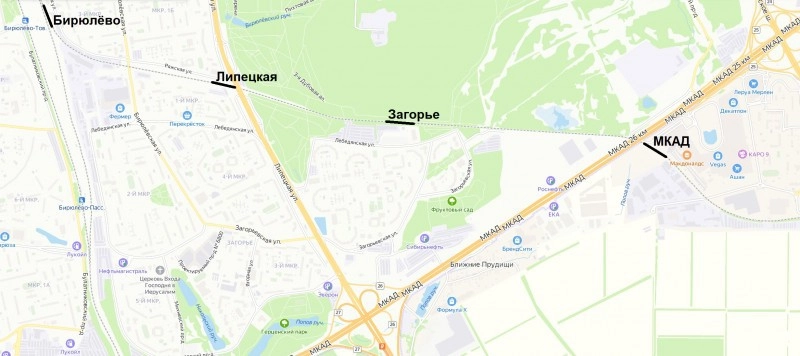 Платформа Загорье на моей схеме располагается между Лебедянской улицей и Бирюлёвским лесопарком. Именно здесь и находится микрорайон Загорье. Но если станции метро дадут это название, здесь лучше использовать как имя Лебедянская, хотя и этот топоним неудачен, так как эта улица продолжается на запад как раз к месту размещения станции метро «Загорье». Что остаётся? Лесопарковой не назовёшь из-за станции метро. Может, просто Лесопарк?