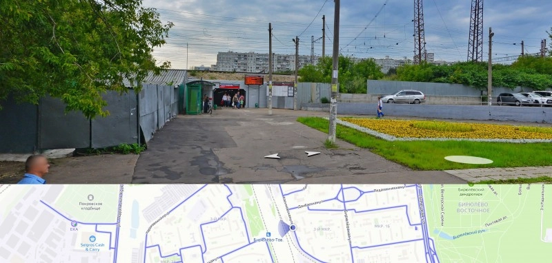 Западная конечная расположится на Бирюево-Товарной, здесь можно будет сделать пересадку на будущий пятый Московский Центральный Диаметр и Павелецкое направление. На платформу нужно вывести сход действующего подземного пешеходного перехода. Выше справа виден один из его сходов, кадра из видео с YouTube-канала «Ч〽3⃣КШН» от февраля 2021-го, красным отметил платформу. С востока это место выглядит так: