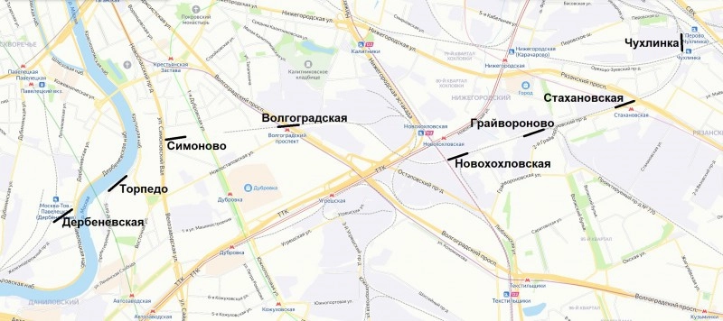 С улицей Молодцова и соседними улицами всё ещё хуже. До станций «Бабушкинская», «Медведково» Калужско-Рижской линии приходится добираться наземным транспортом. Никакой новой линии метро сюда вести не планируется даже в отдалённых планах. Я выделил здесь четыре станции, которые могут быть равномерно расположены на линии. А тут вместе с rajon-pride можно виртуально по ней прогуляться.