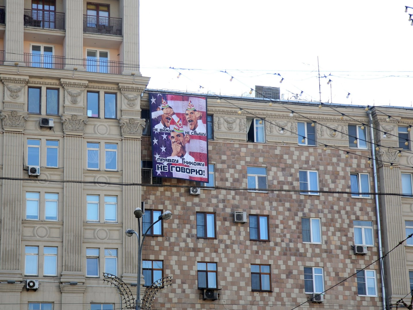 Разница лишь в том, что главный герой вывешенного напротив посольства США плаката — Барак Обама. Надпись на плакате гласит: «не вижу, не слышу, правду никому не скажу».