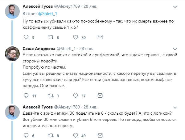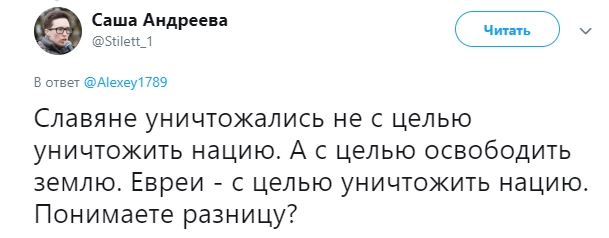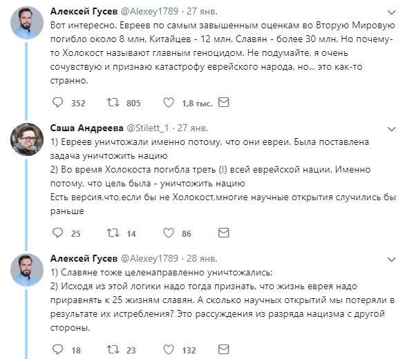 Ситуацию прокомментировал историк и военный эксперт Борис Юлин: «Нацисты, они в любом случае истребляли те народы, которые считали неполноценными. На мой взгляд, искать здесь разницу — пустая трата времени. Политика Третьего рейха и по отношению к евреям, и по отношению к славянам — это совершенно одинаковый геноцид. Хотя если покопаться в деталях, то определенные различия, конечно, найти можно. К примеру, Александра Андреева, должно быть, не в курсе, что изначально Адольф Гитлер не был настроен на уничтожение евреев как нации. Он предлагал изгнать этот народ из Европы, а уже потом, когда изгнание не состоялось, он стал отправлять евреев на смерть. Так что идея создания в Палестине израильского государства принадлежала в том числе и Гитлеру. Когда шло завоевание славянских земель, нацисты уже сразу ставили перед собой задачу уничтожить 30 миллионов славян, а остальных превратить в рабов. Кроме того, гораздо больший процент погибших от рук гитлеровцев был не у евреев, а у другого народа — у цыган. Их вообще почти всех истребили на территории Третьего рейха».