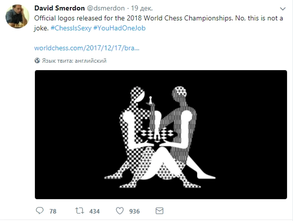 На странный логотип обратили внимание известные шахматисты. «Официально представленный логотип чемпионата мира по шахматам — 2018. Нет, это не шутка», — написал в Twitter австралийский гроссмейстер Дэвид Смердон.