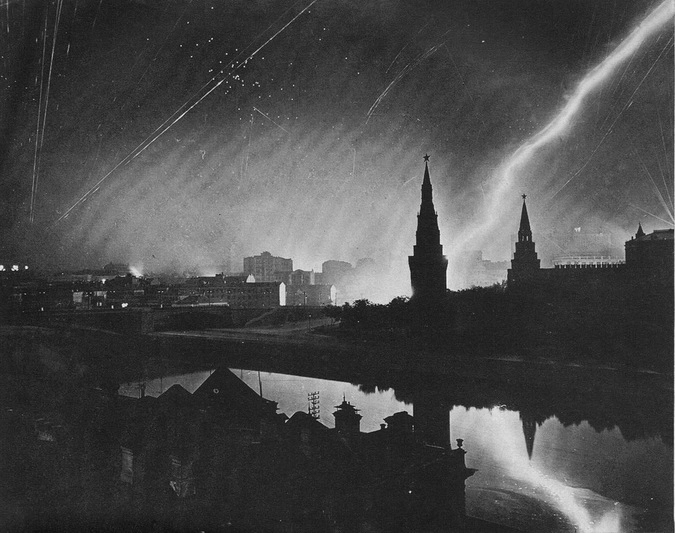 Колокольня Ивана Великого в Кремле во время авианалета. Когда зажигательная бомба сброшена, то у немецких пилотов появляется возможность найти нужные им на земле цели. Черно-белое фото не передает всей яркости цветов в ту ночь. Трассирующие пули оставляют за собой ярко красные следы, взрывы от зенитных снарядов могут быть голубыми, желтыми или оранжевыми, зажигательные бомбы светятся разными цветами, от желтого или оранжевого до красного. Большие всегда светятся ярко белым светом.