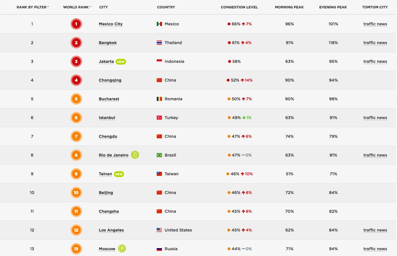 Амбициозная программа развития дорожного полотна Москвы не могла остаться без внимания мирового экспертного сообщества. Специалисты голландской компании TomTom — той самой, что выпускает навигаторы и полезное программное обеспечение для водителей — пощелкали калькуляторами и скорректировали позиции Москвы в своем ежегодном исследовании уровня перегруженности дорог в крупнейших городах мира.