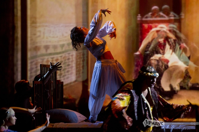 Вместо огромной сцены — столь же огромный экран. Расположенные позади проекторы раскрашивают его самыми разнообразными картинками: метель в чистом поле, звёздное небо, восточный базар, пролёт сквозь грозовые тучи… Изображение объёмное: рабыни в золотых клетках кажутся живыми, три кобры высотою с дом так и бросаются в сторону партера. Порой 3D перерастает в 4D — когда компьютерные брызги смешиваются с настоящими, все первые ряды оказываются натурально обрызганными. Центральный фокус (из тех фрагментов, что были показаны столичной прессе) — длиною в песню полёт на самолёте над горами да над облаками, после чего — на крыше поезда да в тоннель!..