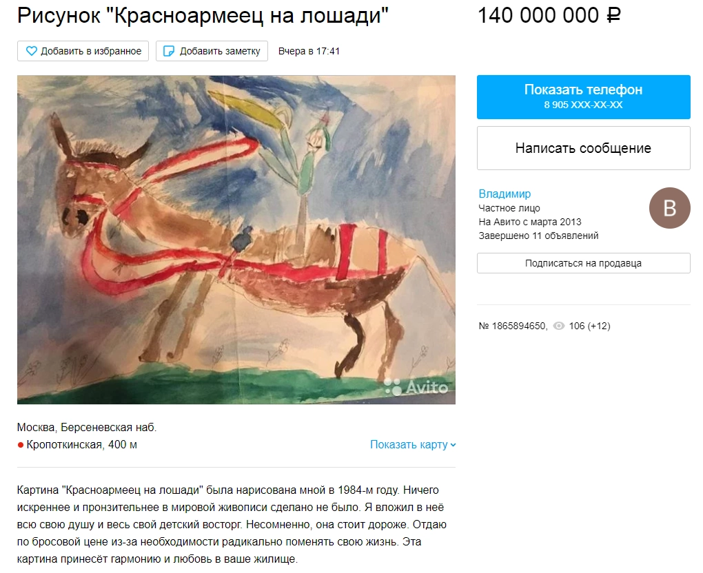 Житель Москвы, именующий себя Владимиром, выставил на продажу на интернет-ресурсе Avito свой детский рисунок, изображающий красноармейца на лошади. Первым делом в объявлении бросается в глаза цена живописной работы — 140 млн рублей.