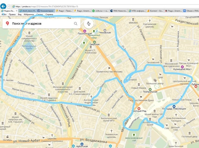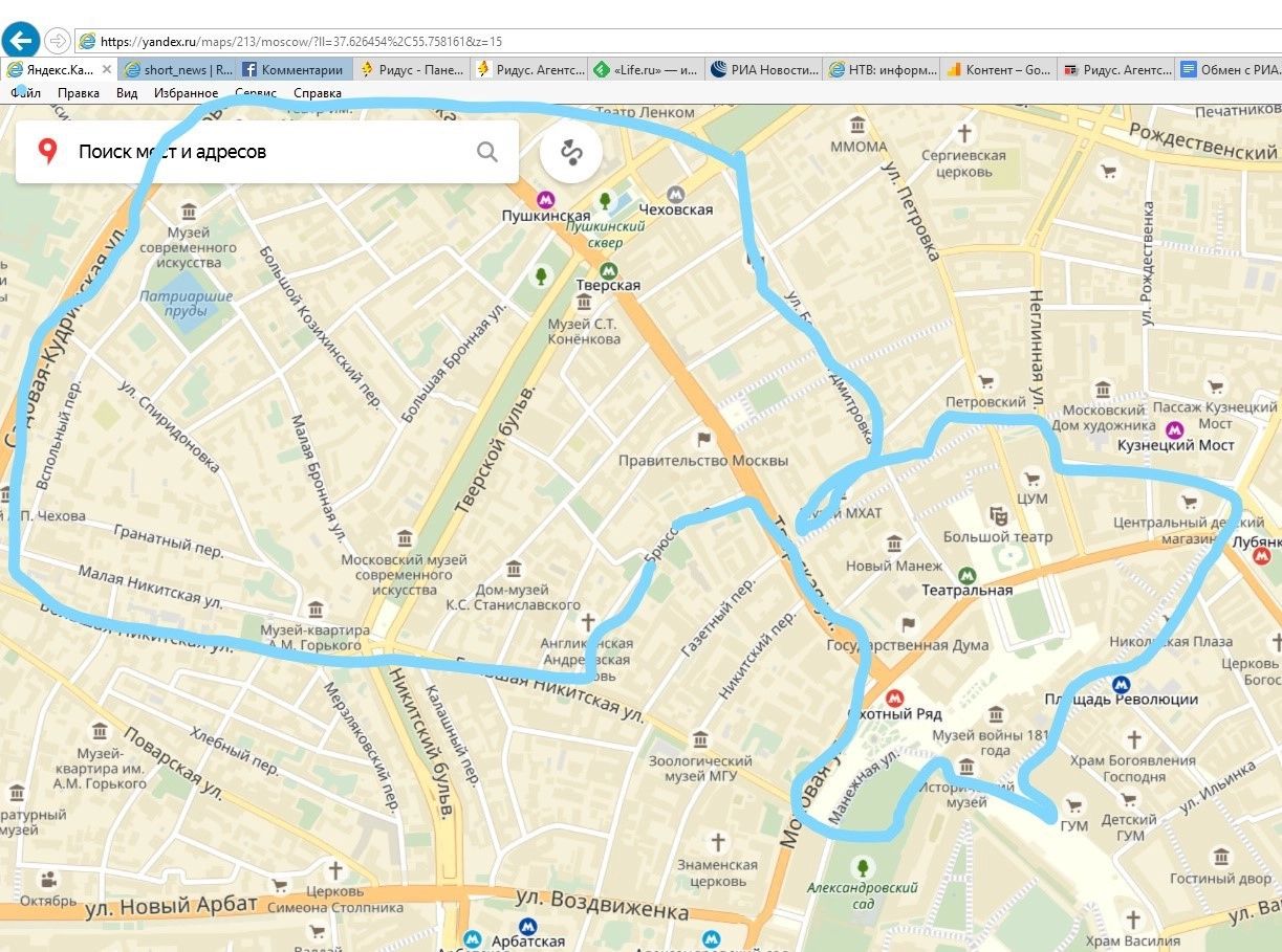 Приблизительный маршрут пары от места парковки в Брюсовом переулке на Красную площадь и обратно
