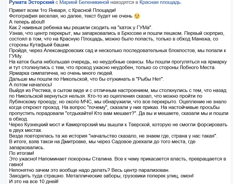 «Это ужасно! Напоминает похороны Сталина. Все к чему прикасается власть, превращается в гавно! Непонятно зачем это вообще надо делать? Весь центр парализован. Заходить туда страшно. Металлические заборы, грузовики поперек улиц, омон! И это на все 10 дней!», — написал возмущенный Румата.