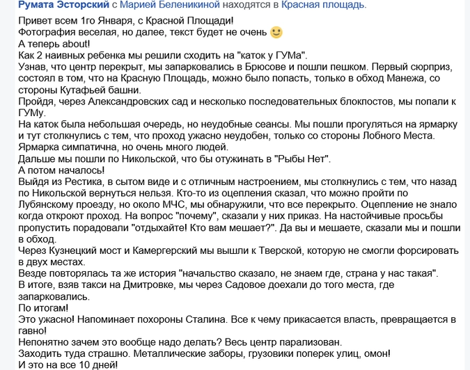 Москвич рассказал о бессмысленных ограждениях в центре столицы и о трудностях, с которыми ему пришлось столкнутся в новогоднюю ночь. Своей невеселой историей человек с ником Румата Эсторский поделился в Facebook.
