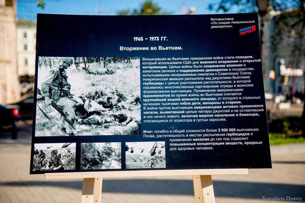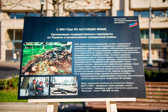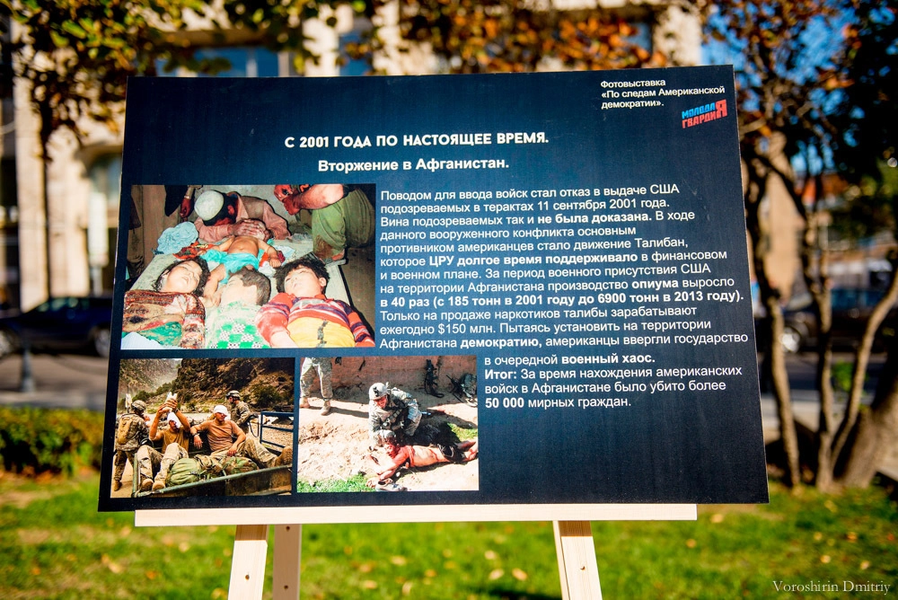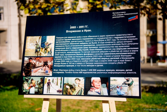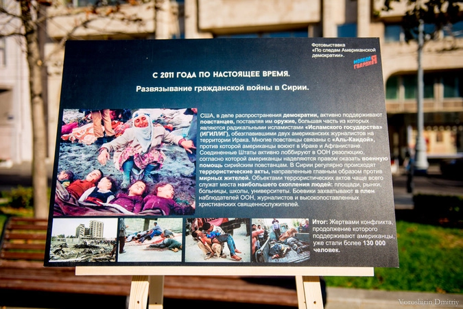 На 20-ти стендах были размещены изображения с описанием событий в мировой истории, к которым привела внутренняя и внешняя политика США. Фотовыставка содержала информацию о государствах, подвергнувшихся американской «демократизации»: официальные причины развязанной агрессии и ее последствия – от истребления коренных народов Североамериканского континента до военных операций на Ближнем Востоке и Балканах.