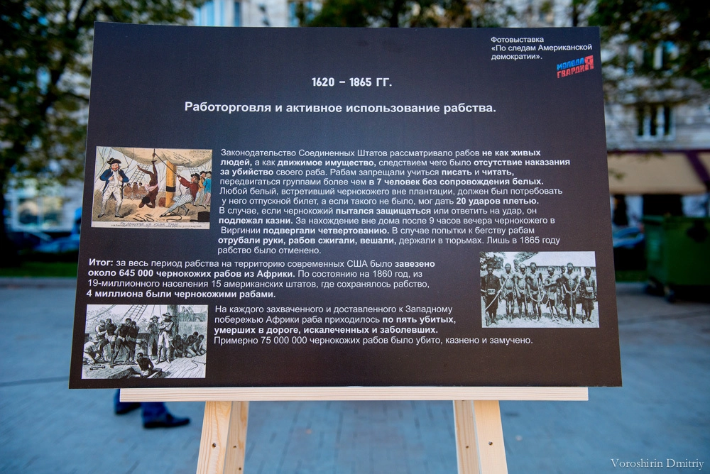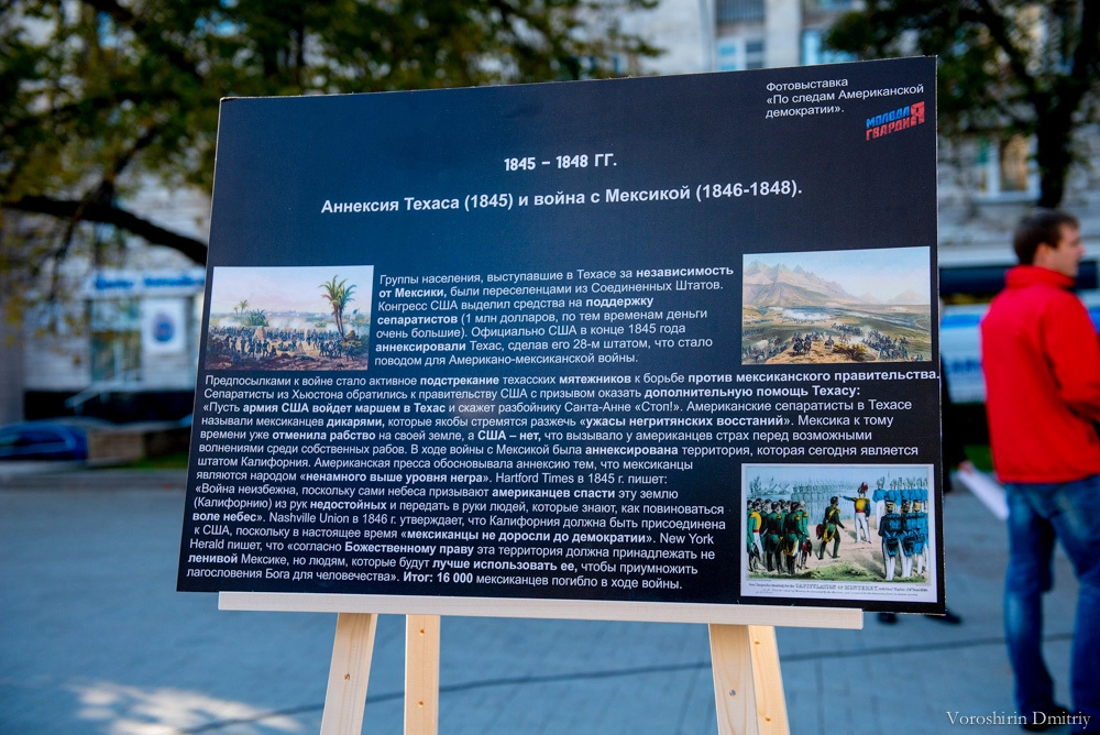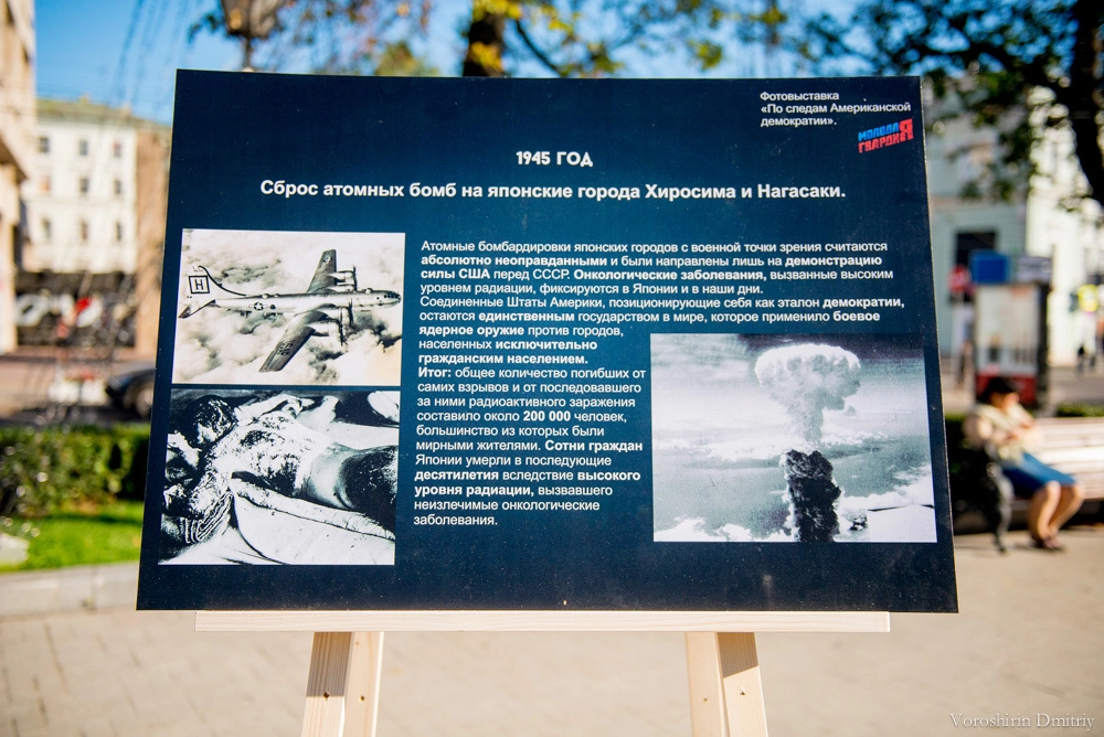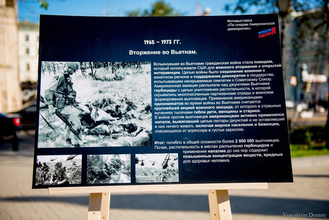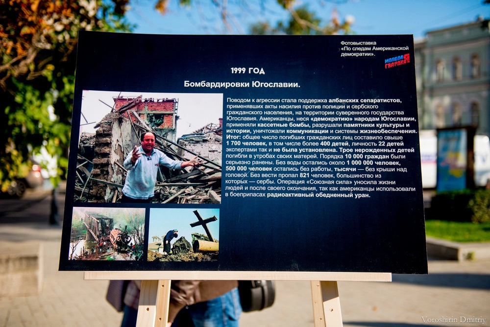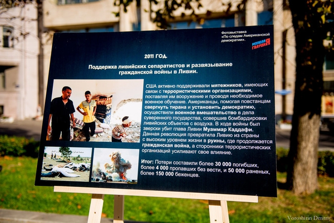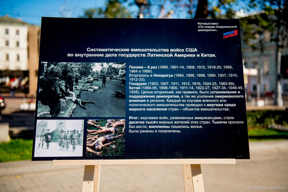 – В настоящее время понятие демократии сильно искажено, и ряд западных государств, входящих в НАТО, под предлогом защиты демократических ценностей и установления демократических форм правления развязывают в некоторых государствах войны. Инициаторами данных процессов зачастую выступают США. У некоторых людей, которые не очень хорошо разбираются в политике, может сложиться мнение, что такая ситуация нормальна. Поэтому сегодня, в Международный день демократии, мы решили показать выставку «достижений» Соединенных Штатов на мировой арене, назвав ее «По следам американской демократии».