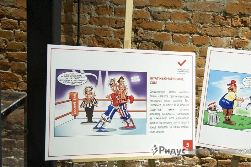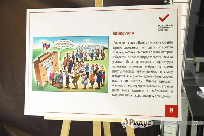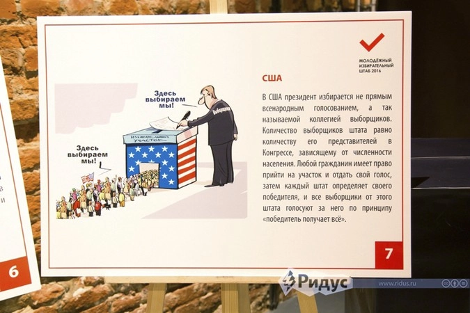 В экспозиции представлены одиннадцать плакатов с иллюстрированной информацией о том, как проходят выборы в различных странах мира.