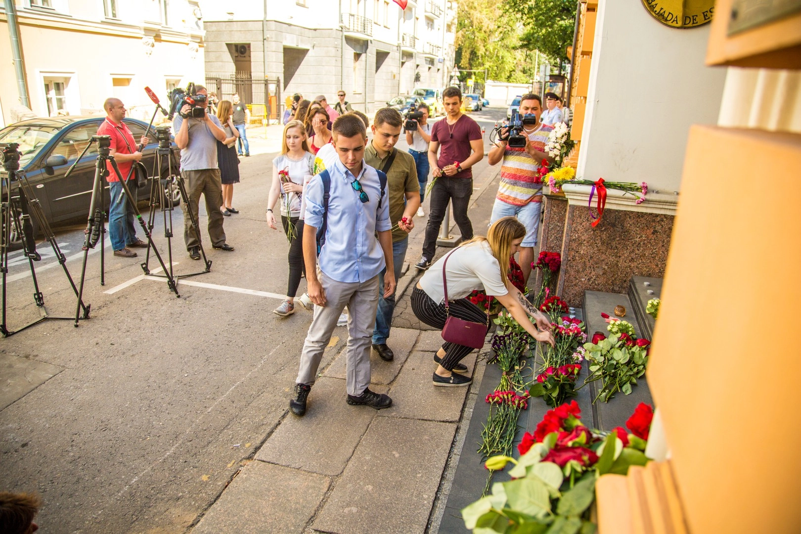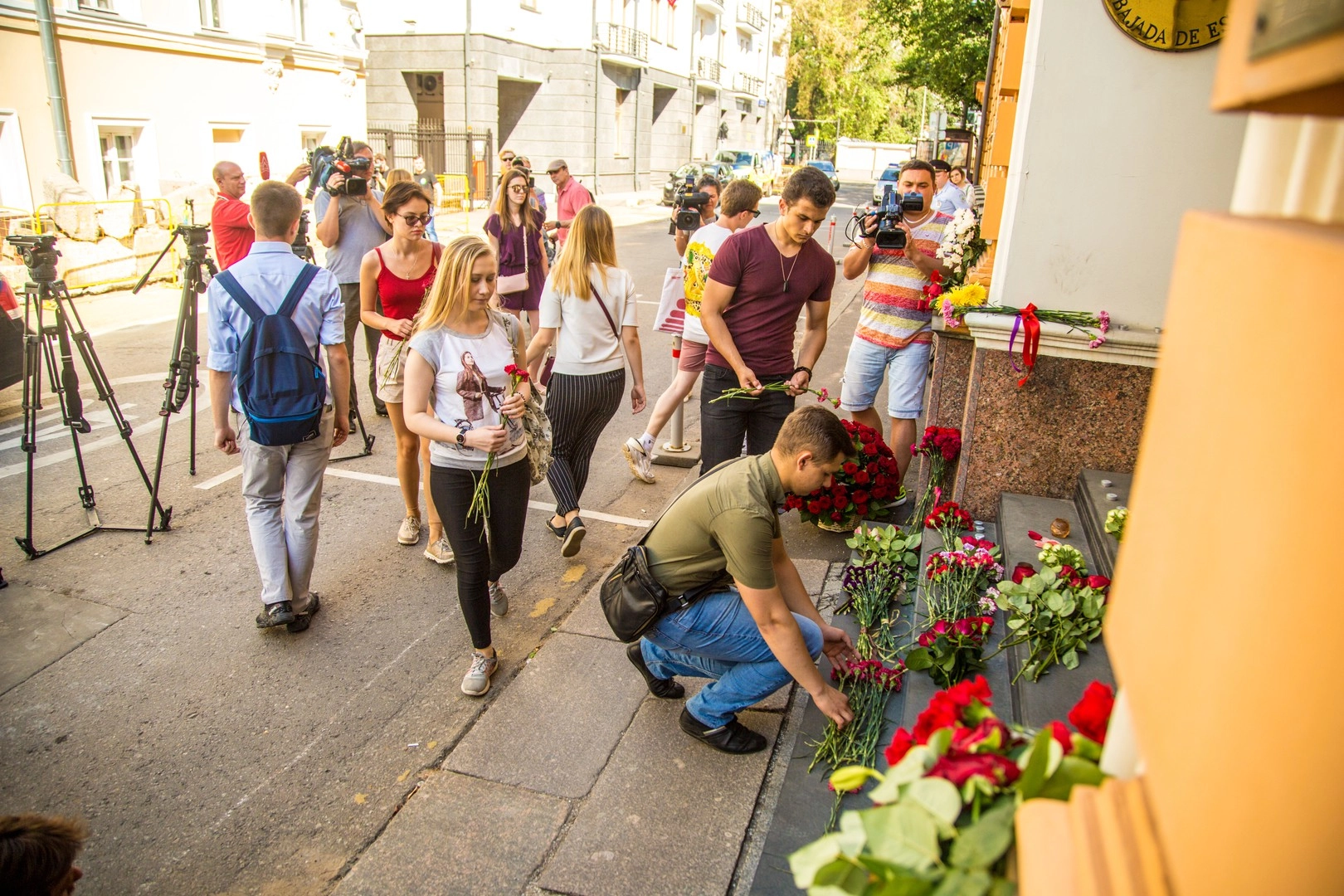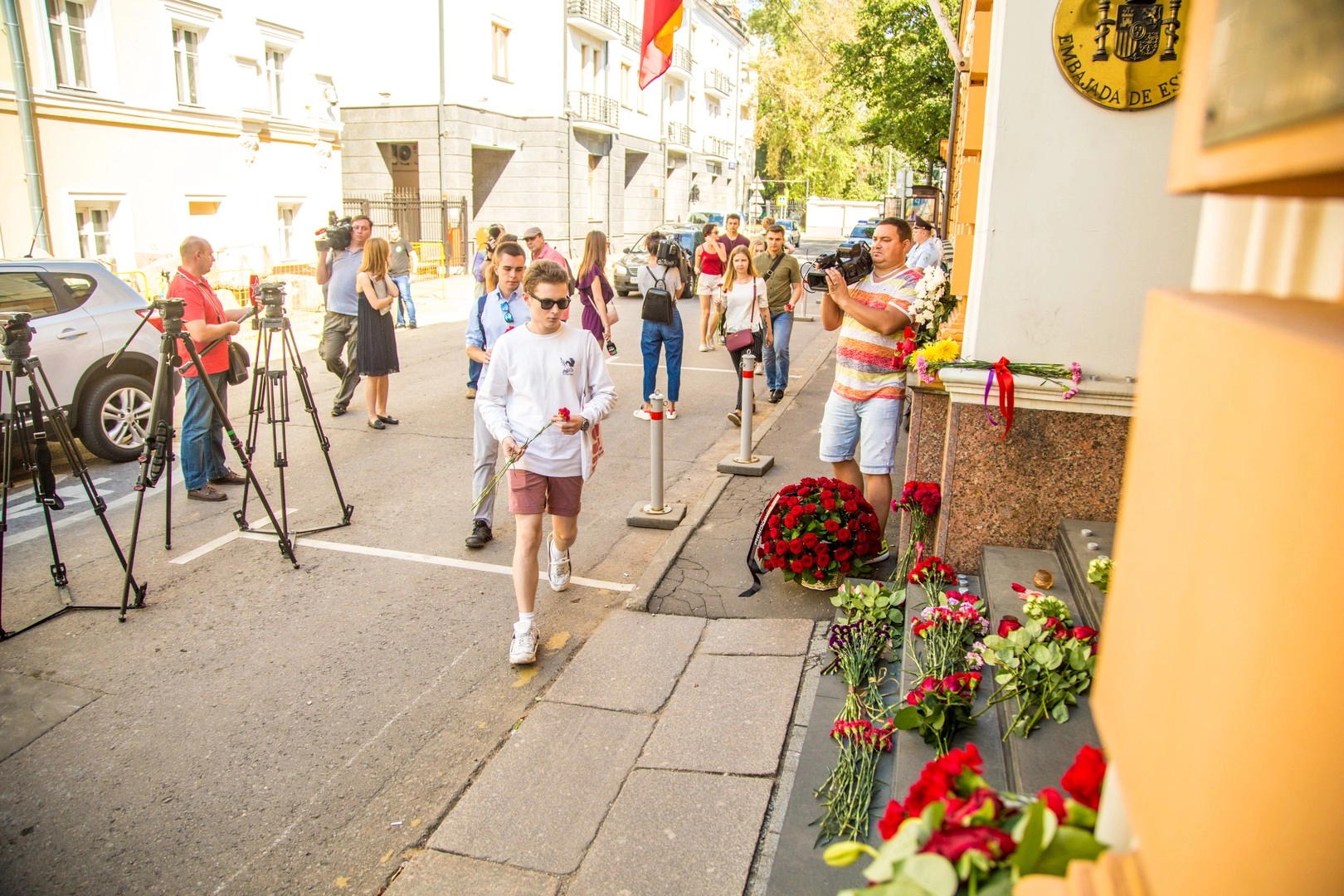 Москвичи несут цветы и свечи к посольству Испании в память о жертвах теракта в центре Барселоны, когда на большой скорости в толпу въехал фургон.