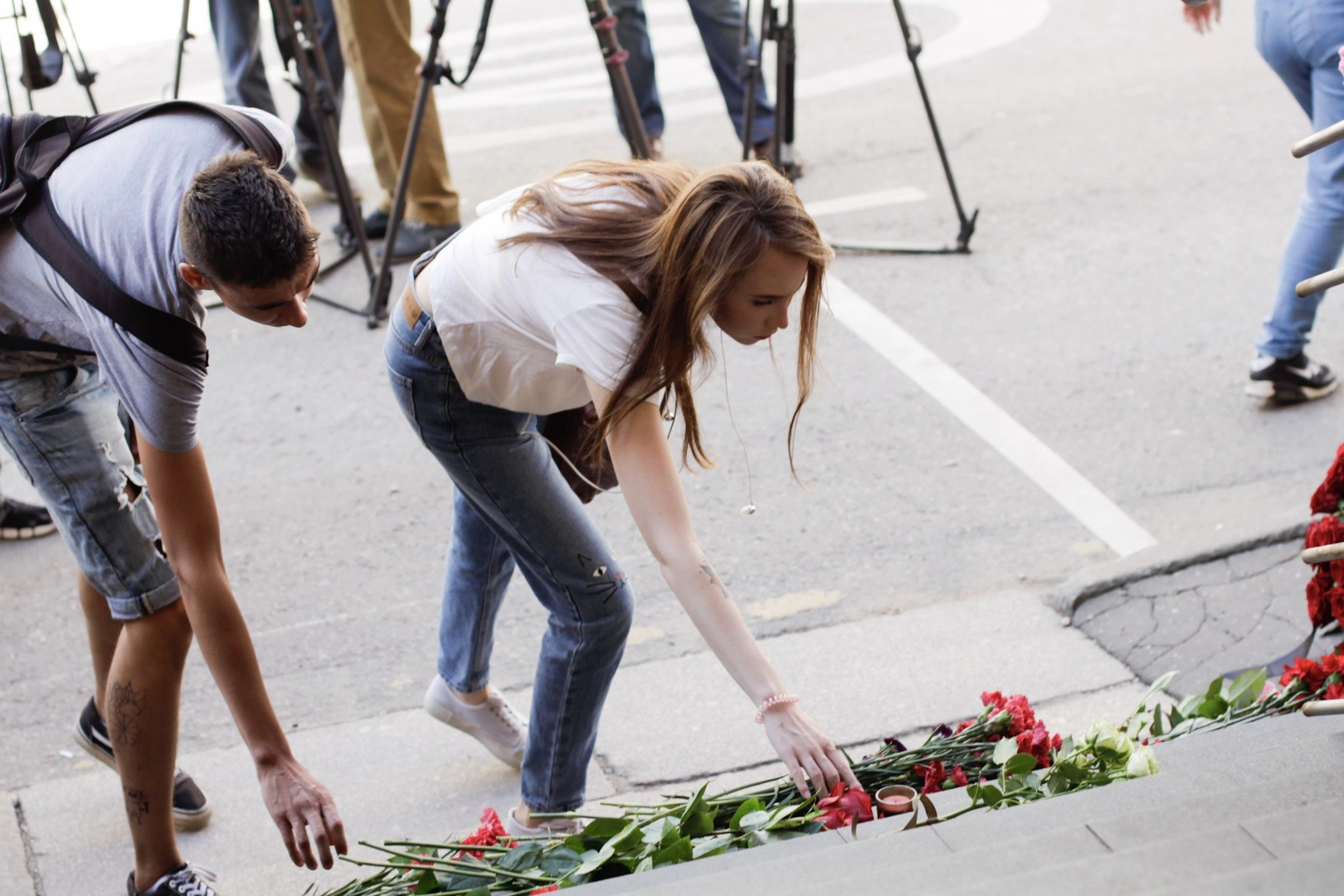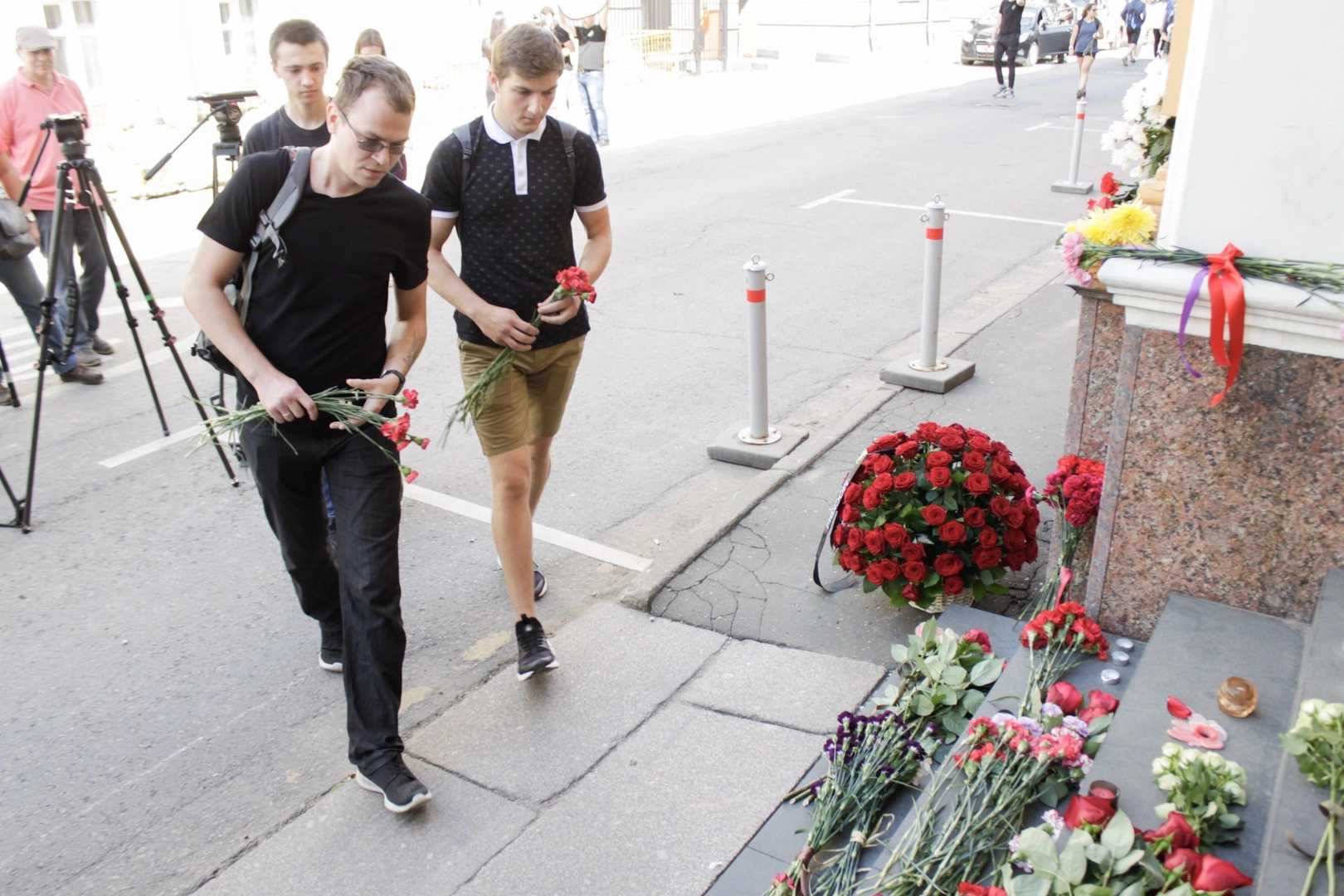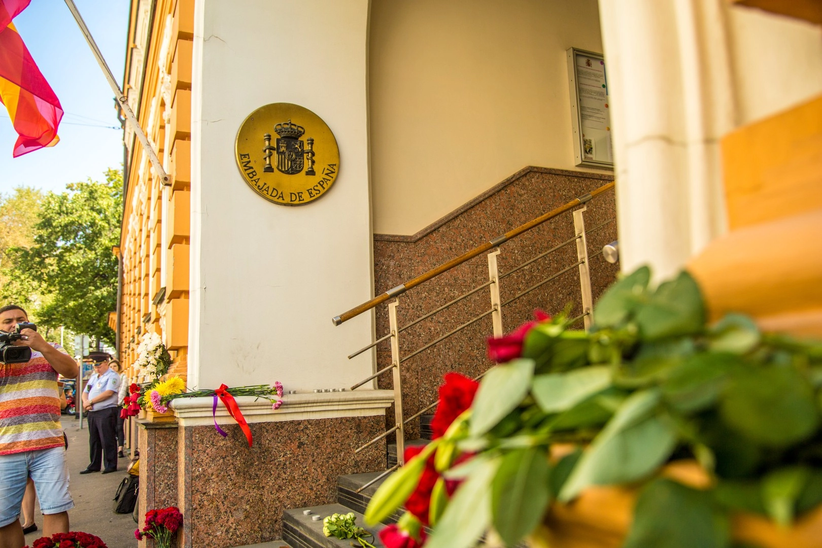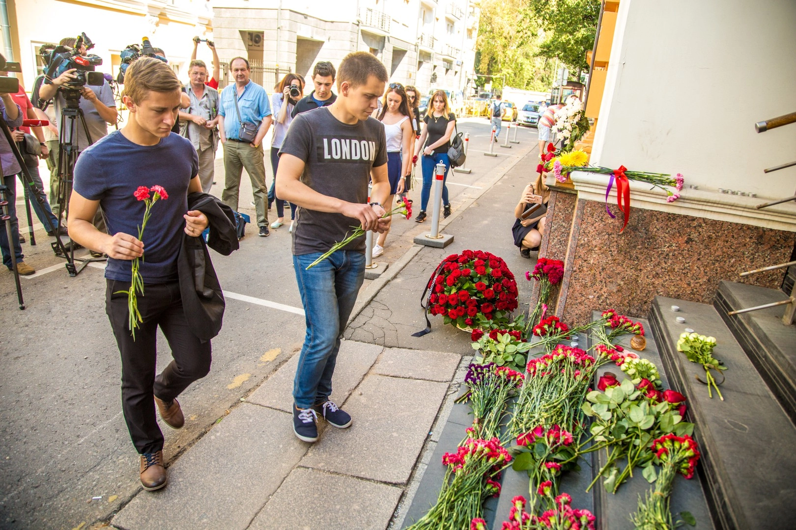 Москвичи несут цветы и свечи к посольству Испании в память о жертвах теракта в центре Барселоны, когда на большой скорости в толпу въехал фургон.