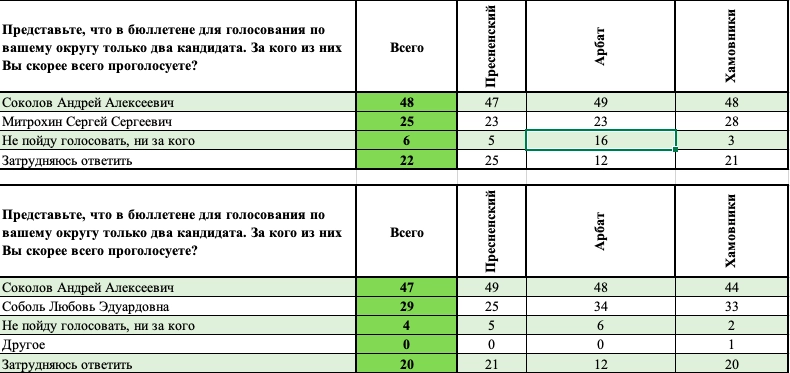По данным социологов, Соколов уверенно лидирует среди других кандидатов по округу. "В ответах на вопрос, за кого бы они проголосовали, если б в бюллетене было всего два кандидата, Соколов и Митрохин, 48% выбирают Соколова, 25% - Митрохина. Делая выбор между Соколовым и Соболь, горожане опять же выбирают Соколова – 47% против 29%".