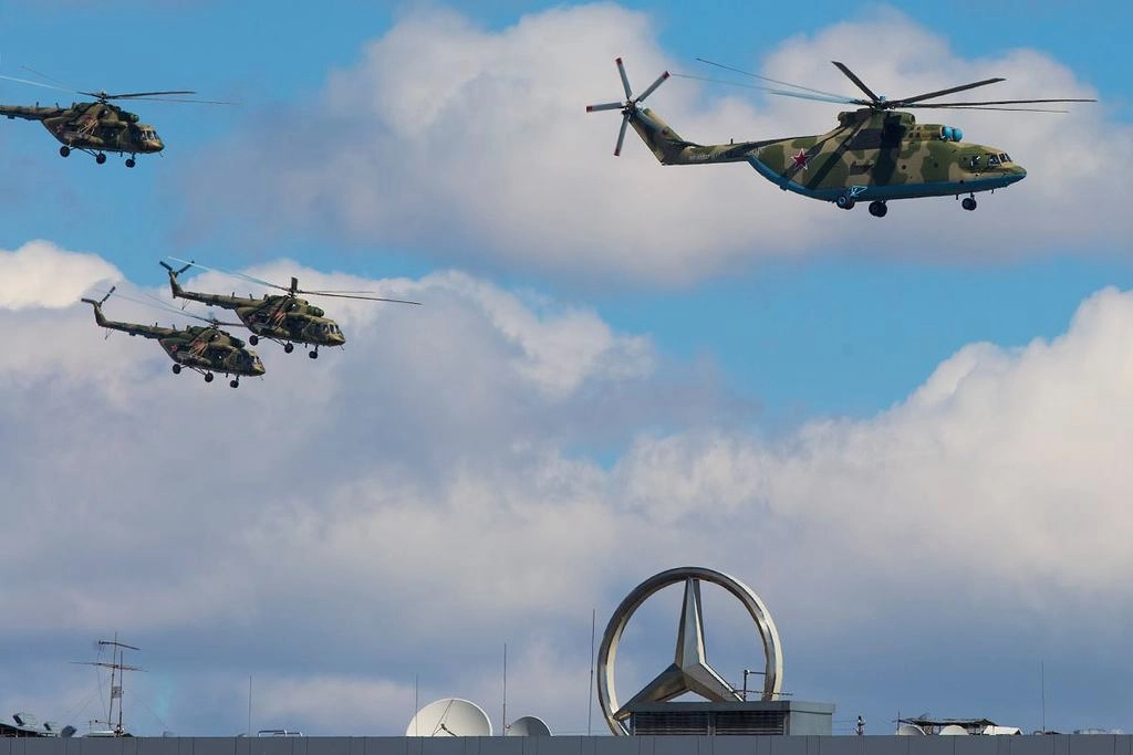 На высоте 150 метров со скоростью 200 километров в час над Москвой прошел строй вертолетов: самый большой в мире вертолет-транспортник Ми-26 в сопровождении четырех Ми-8, а также Ми-28Н, Ми-35, Ка-52.