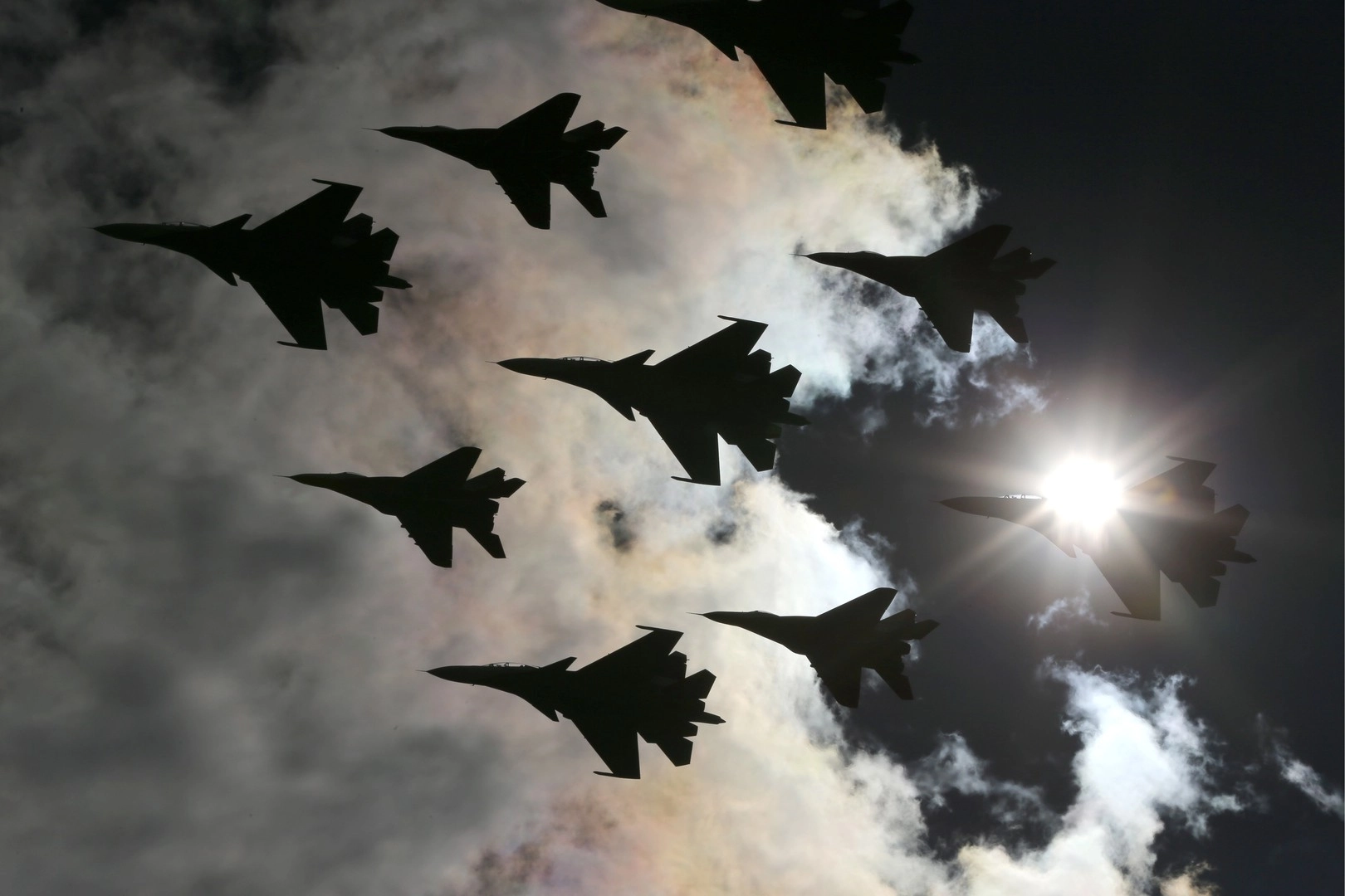 Следом за ними вылетели экипажи оперативно-тактической, дальней и военно-транспортной авиации, чья скорость составила не менее 500 километров в час: четыре дальних бомбардировщика Ту-22М3 во главе со стратегическим ракетоносцем Ту-160 «Белый лебедь», бомбардировщики Ту-95МС, самолеты-заправщики Ил-78, военно-транспортные самолеты Ан-124 и Ил-76МД, истребители Су-35С, Су-ЗОСМ, Су-27, МиГ-29, МиГ-31БМ, фронтовые бомбардировщики Су-34, Су-24М, штурмовики Су-25 и учебно-боевые самолеты Як-130.