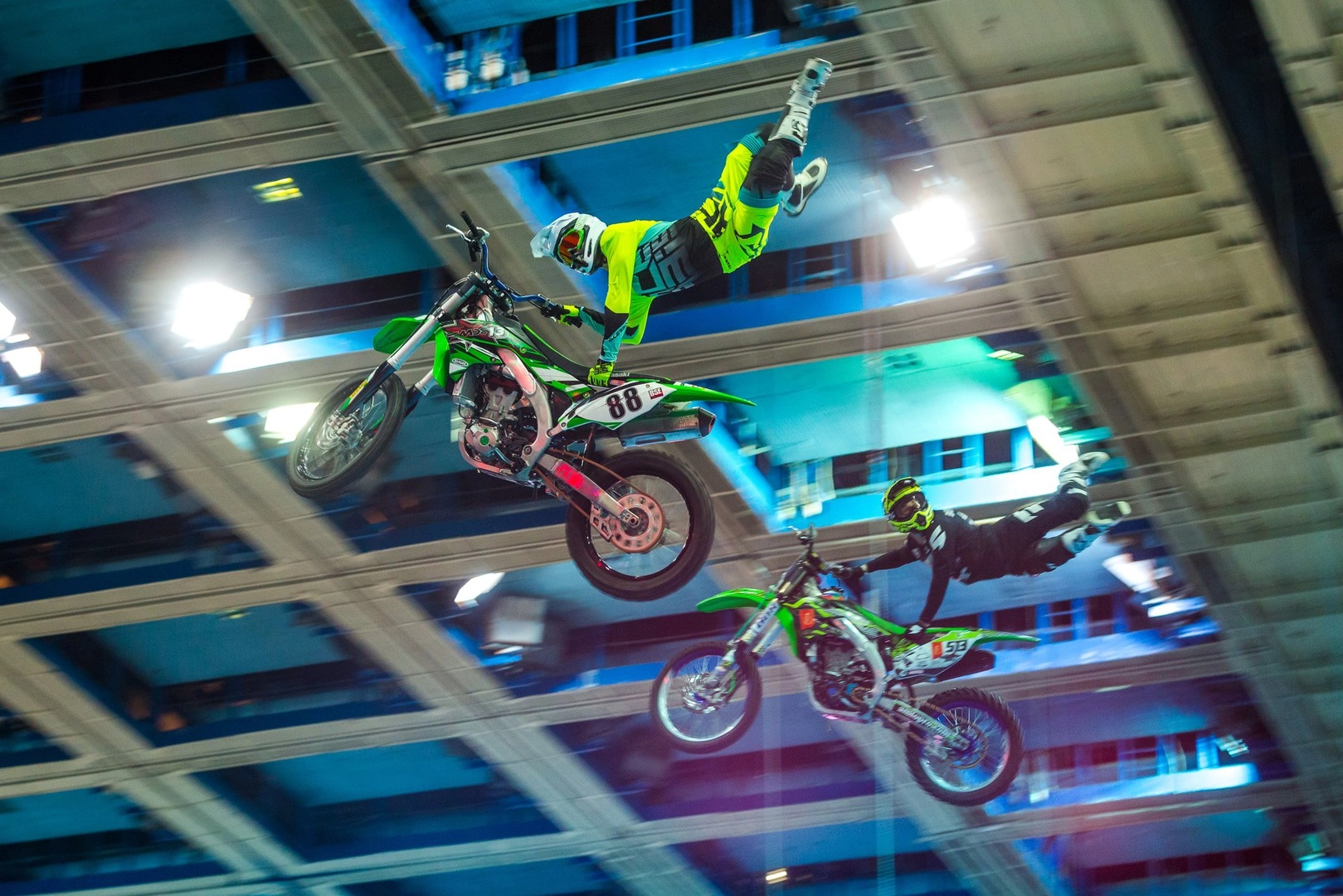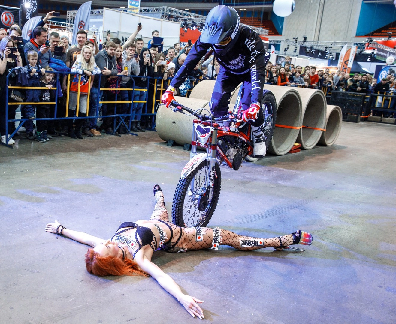 Кастомы — это красиво, но не всегда быстро. Для любителей скорости прямо на арене «Олимпийского» организовали большую спортивную зону Motul Extreme Show, за которой было удобно наблюдать с трибун в перерывах между изучением экспонатов. Фристайлеры прыгали с огромной рампы через весь зал, взлетая под потолок. В перерывах между трамплинами показывал трюковое квадроциклетное шоу Григорий Талдыкин с двумя пешими акробатами. По-настоящему свежее зрелище привезли фрацузские триалисты Жюльен Дюпон, Кенни Томас и их российские коллеги, Александр и Антон Фроловы. Всемирно известные спортсмены выступали на трасе из бетонных колец, сварных металлических кубов, морского контейнера, грузовых колес и трамплинов, перепрыгивали через лежащих людей, крутили сальто и соревновались в скоростном прохождении препятствий, так что в шоу был и состязательный момент.