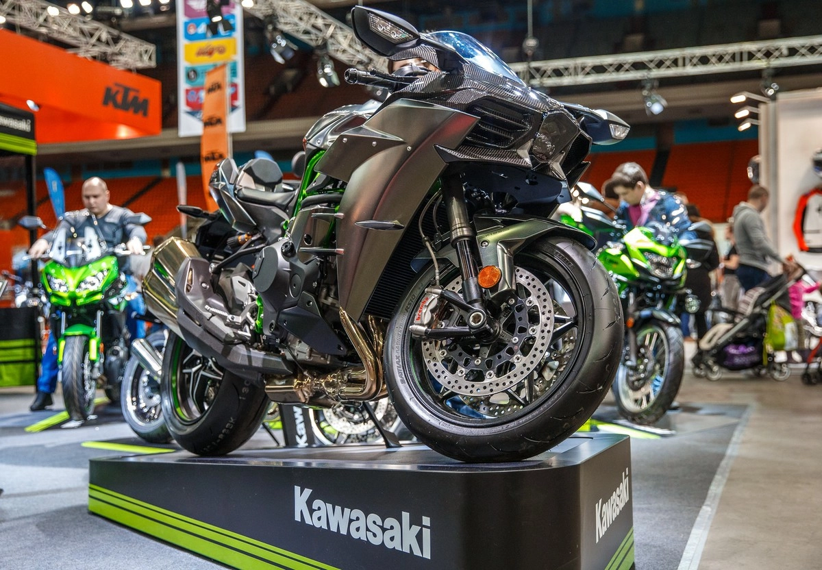 В центре стенда Kawasaki стоял турбированный Ninja H2 и большая линейка более доступных моделей.