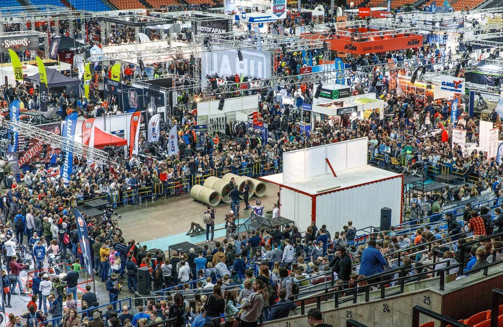В этом году шестая выставка техники для активного отдыха «Мотозима-2018» прошла на новом месте. Спорткомплекс «Олимпийский» стал самой представительной площадкой в истории российских мотовыставок. Главное преимущество центральной арены «Олимпийского» — огромное пространство не только на площадке, но и над ней. Его хватило, чтобы объединить под одной крышей несколько трудносовместимых видов программы. Посетители осматривали экспозицию, смотрели выступления спортсменов-экстремалов, слушали концерты, расслаблялись в кафе, и всё это в одном помещении.