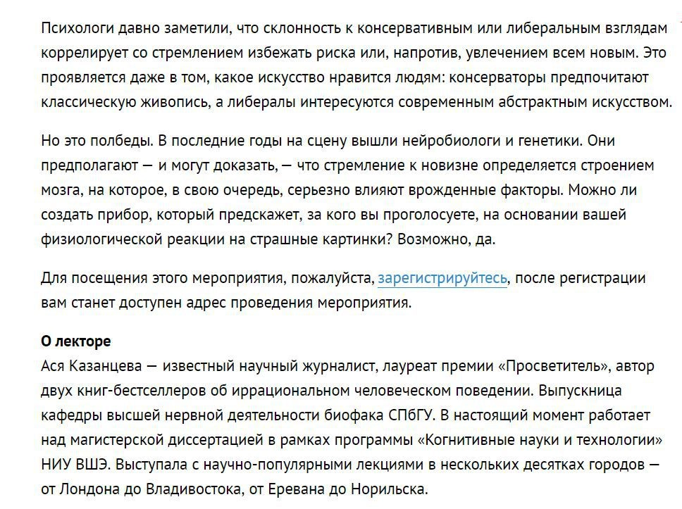 «Научный журналист Ася Казанцева проведет открытую встречу в федеральном штабе Собчак и расскажет, чем мозг либерала отличается от мозга консерватора. Для посещения этого мероприятия, пожалуйста, зарегистрируйтесь, после регистрации вам станет доступен адрес проведения мероприятия», — завлекает доверчивых пользователей сайт Собчак.