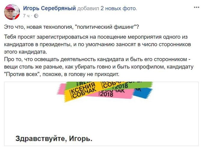 Телеведущую Ксению Собчак поймали на «политическом фишинге»: ее сайт «СобчакПротивВсех.ру» анонсирует научно-популярные лекции без указания на адрес их проведения, предлагая зарегистрироваться, чтобы узнать эту информацию. После регистрации интересующийся пользователь получает сообщение о том, что он записался в сторонники Собчак, но адрес так и остается неизвестным.