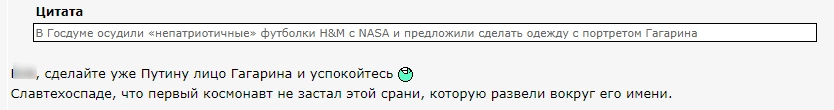 Возможно, акция Роскосмоса стала ответом футболкам с логотипом американских коллег из NASA, которые продает в России компания H&M. В Государственной думе уже осудили их ношение россиянами как «непатриотичное».