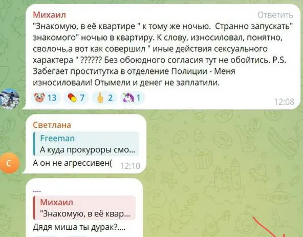 «Знакомую, в её квартире, к тому же ночью. Странно запускать „знакомого” ночью в квартиру... Изнасиловал — понятно, сволочь. А вот как совершил „иные действия сексуального характера”? Без обоюдного согласия тут не обойтись», — заявил муниципальный депутат от «Единой России» в Telegram-чате.