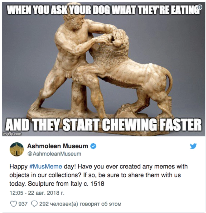 В мировом календаре есть необычный праздник — День музейных мемов. В этот день музеи всего мира и присоединившиеся к ним библиотеки публикуют в соцсетях самые остроумные мемы под хештегом #MusMeme. На произведения живописи и скульптуры добавили остроумные надписи, которые озвучивают всё, что волнует современного человека. Развлекательная акция стала мегапопулярной в интернете. Пользователей порадовали как зарубежные, так и отечественные музеи. Но лучшим, по мнению многих, стал Пушкинский музей. Собрали для вас больше 30 самых весёлых картинок.