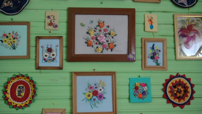 Музей состоит из двух комнат: гостевой и непосредственно музейной. В передней части дома посетителей встречают результаты кропотливого труда мастериц по вышивке лентами – это самый распространенный вид рукоделия в Слободе.