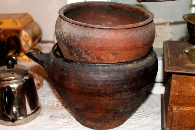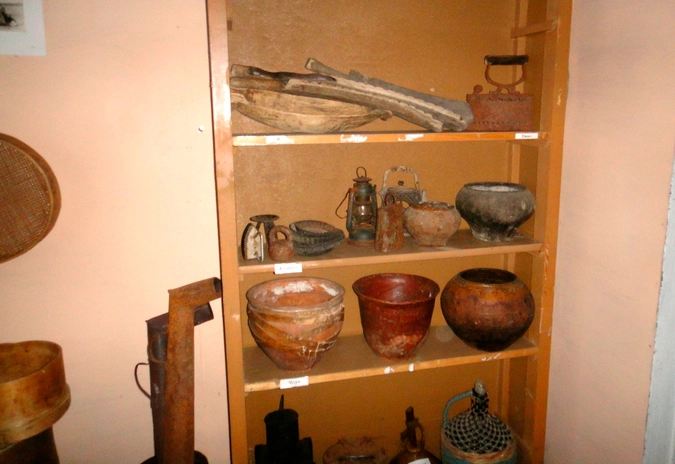 Кроме того, здесь собрано множество глиняных и чугунных горшочков, в которых в печи готовились самые простые деревенские блюда (чаще всего каши и супы). В связи с тем, что в деревнях частенько случались перебои с электричеством – свет отключали – в обиходе односельчан широкое применение нашли керосиновые лампы различной формы, цены и конструкции. Использовались даже своеобразные фонари, имеющие чугунный корпус и стеклянные стенки, внутрь же ставили уже знакомую керосиновую лампу. Такие изобретения позволяли зимними вечерами осветить тропинку к сараю или спуститься в погреб.