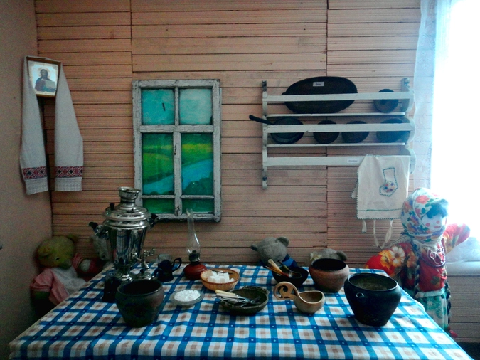 Музейная комната оформлена в стиле деревенского дома XIX в. Один угол занят «кухней». Маленькое окно с видом на речушку, икона в углу, на столе: самовар, чугунная и деревянная посуда– все как полагается.