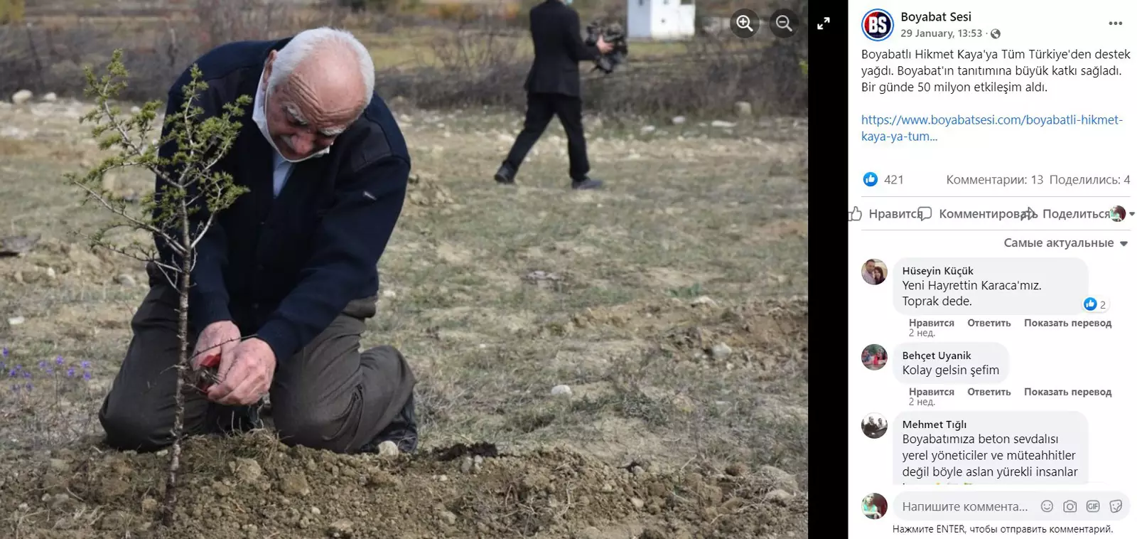 Лесной техник из Турции по имени Хикмет Кая полностью изменил облик пустынной территории Боябатского района в провинции Синоп, посадив более 25 миллионов саженцев. Он превратил негостеприимную землю в оазис, чтобы она радовала людей и животных.